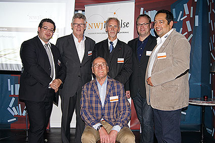 v.l.n.r.: Karsten Schramm (IBB), Heinrich Meyer (DAA), Heiner Nebel (NWJ), Tobias Sprenger (DAA), Michael Basakidis (Umweltdruckhaus Hannover und vorn sitzend Theaterleiter Wolfgang Werner (WGC)
