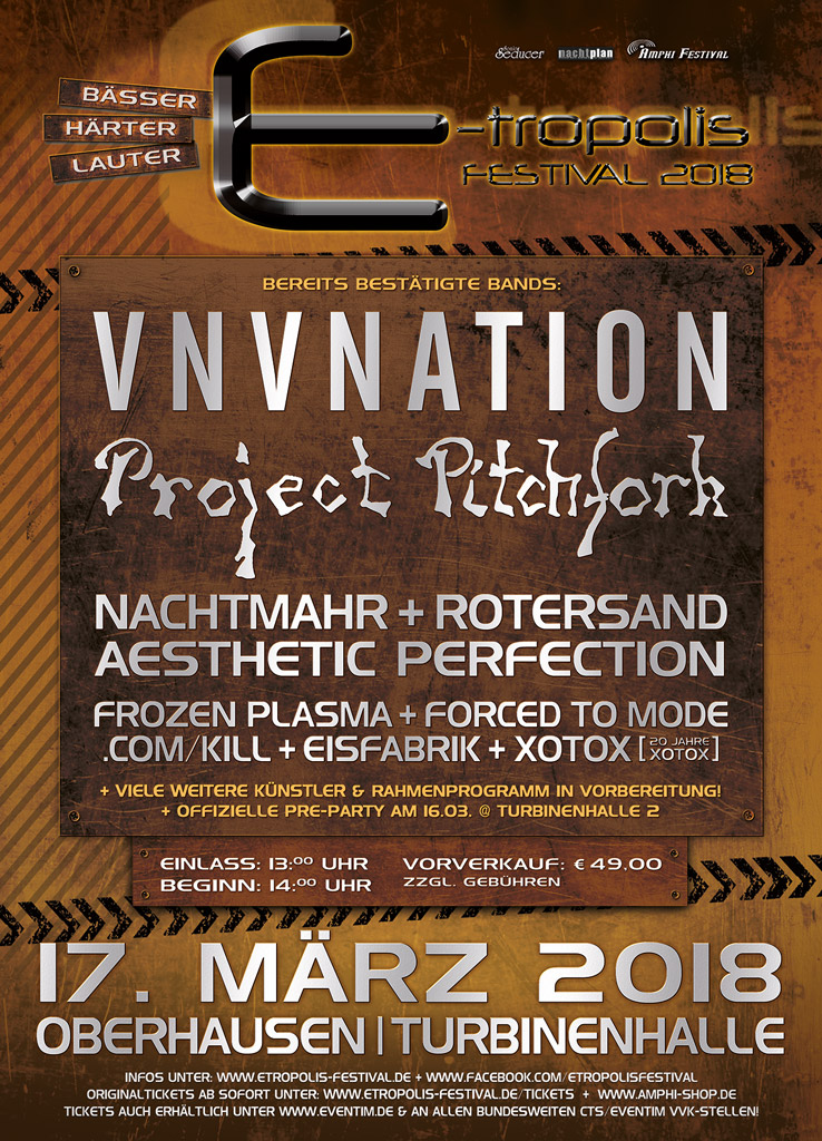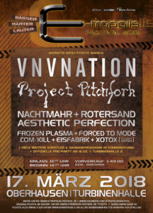 Große Ereignisse werfen ihre Schatten voraus. Mit VNV Nation und Project Pitchfork hat das e-tropolis Festival in Oberhausen zwei hochkarätige Headliner für die Ausgabe 2018 am Start! Hier die aktuelle Pressemeldung der Veranstalter mit allen relevanten Infos: