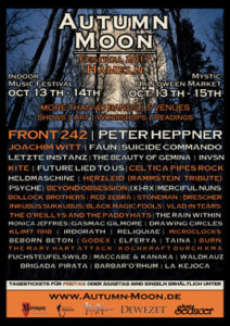 FRONT 242, PETER HEPPNER, JOACHIM WITT, FAUN, SUICIDE COMMANDO, LETZTE INSTANZ, THE BEAUTY OF GEMINA, HERZLEID (Rammstein Tribute Show), BOLLOCK BROTHERS, STONEMAN, KITE, CELTIC PIPES ROCK, VLAS IN TEARS, MERCIFUL NUNS, PSYCHE, BEYOND OBSESSION, THE O’REILLYS AND THE PADDYHATS, HELDMASCHINE, DRESCHER, [X]-RX, INKUBUS SUKKUBUS, RED ZEBRA, BURN, THE RAIN WITHIN, MONICA JEFFRIES, BLACK MAGIC FOOLS, FUCHSTEUFELSWILD, MICROCLOCKS, DRAWING CIRCLES, TAINA, KOCHKRAFT DURCH KMA, GODEX, GASMAC GILMORE, KLIMT 1918, IRDORATH, RELIQUIAE, BEBORN BETON, ELFERYA, THE MARY HART ATTACK, BRIGIDA PIRATA, LA KEJOCA, BARBAR’O’RHUM, MACCABE & KANAKA, u.v.a.