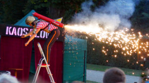 Bis es um 22:00 Uhr zur Feuershow kam, stellte der Kaosclown seine Art der Pyrotechnik vor, was auf der Freitreppe durch des Clowns witzige Zauberei-Einlagen und schräger Artistik gepaart mit charmanter Comedy das Publikum begeisterte.